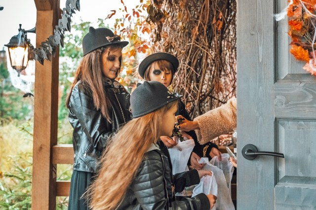 In 2025, candy is not enough. If you really want to be the house everyone in the neighborhood has to stop at, consider adding a Halloween photo op for trick-or-treators. This could be anything from an elaborate display with super-sized decorations and homemade monster cutouts (think “face-in-a-hole” displays), to a simple backdrop with fake spider webs and pumpkins. Just make sure there’s some light source to not only illuminate the display so people stop, but to make sure photos turn out Instagram-worthy.
