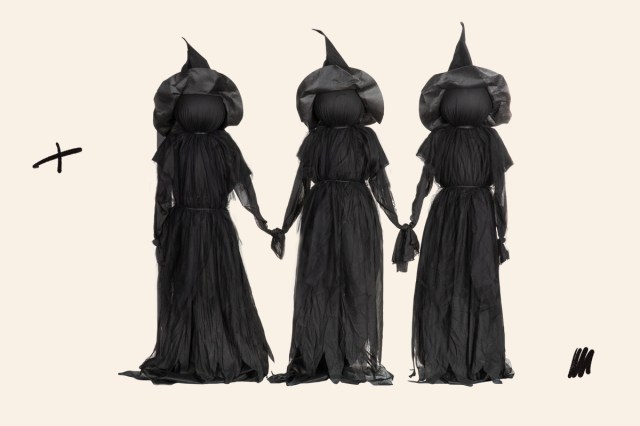 This trio of witches makes for a subtly spooky Halloween setup. They look great during the day as black shadows swaying in the wind, and at night, when the battery-operated heads glow and flicker. Your yard will instantly look better, whether you leave them as is or mix them with other decor you might have, like a cauldron and pumpkins.