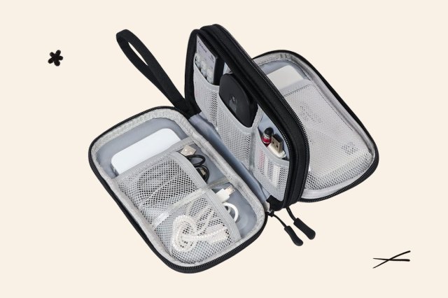 When taking your technology on the go, you want to access your chargers without digging to the bottom of your carefully arranged bag — enter the cable organizer. Using one also ensures that cables won’t get tangled up in each other and stuck in crevices. It fits an extra charging bank and earbuds too.
